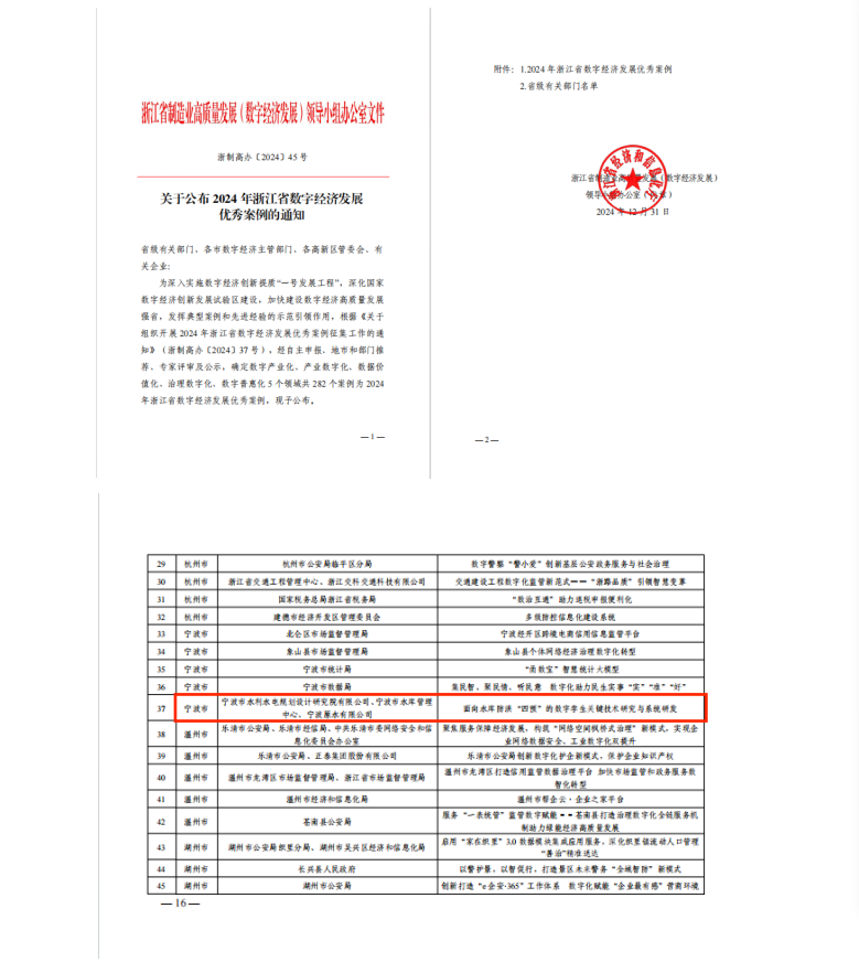 近日,浙江省經(jīng)濟和信息化廳發(fā)布《2024年浙江省數(shù)字經(jīng)濟優(yōu)秀案例擬確定名單》并完成公示,我院與寧波市水庫管理中心、寧波原水有限公司聯(lián)合申報的“面向水庫防洪‘四預’的數(shù)字孿生關鍵技術研究與系統(tǒng)研發(fā)”案例成功入選。