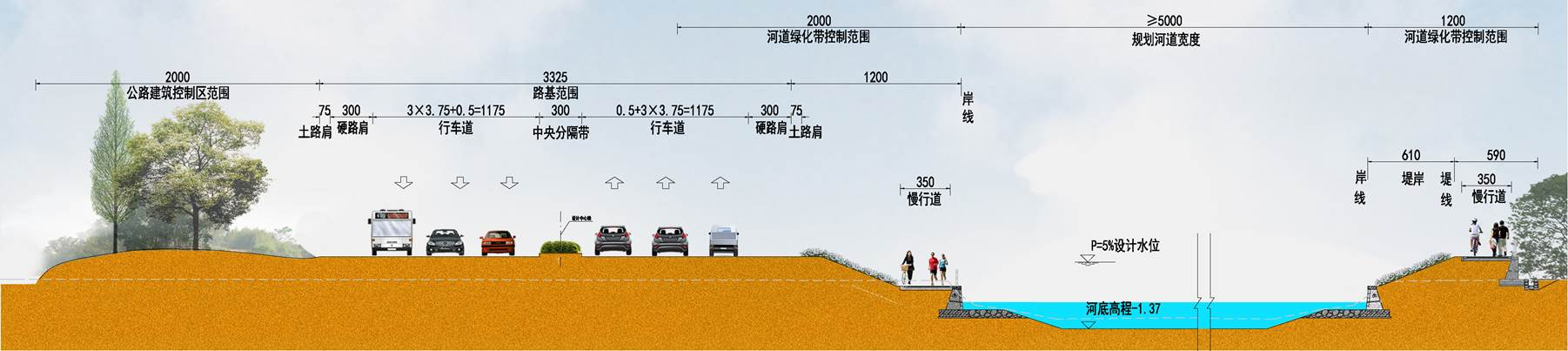 工程位于海曙區(qū)西側(cè),南起鄞江,北至姚江,為實(shí)現(xiàn)對海曙西側(cè)山區(qū)洪水的攔截,共整治河道長24km,建設(shè)閘站40座,閘門總凈寬554m,泵站22m3/s,改建新建橋梁42座。其中有3.5km與G228國道并線,為協(xié)調(diào)國道與河道之間用地布局,通過優(yōu)化河道斷面型式和堤線線位,實(shí)現(xiàn)了對土地的集約利用,打造一條海曙西部交通和河道的靚麗風(fēng)景線。