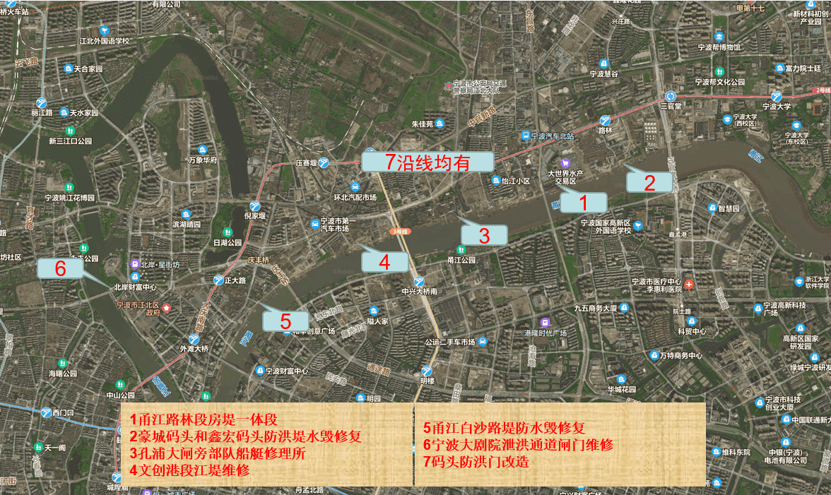 本工程建設(shè)內(nèi)容包括甬江路林段房堤一體段、豪城碼頭和鑫宏碼頭防洪堤水毀修復(fù);孔浦大閘旁部隊(duì)船艇修理所、文創(chuàng)港段江堤維修;甬江白沙路堤防水毀修復(fù);寧波大劇院泄洪通道閘門(mén)維修;碼頭防洪門(mén)改造等水毀修復(fù)水利工作。