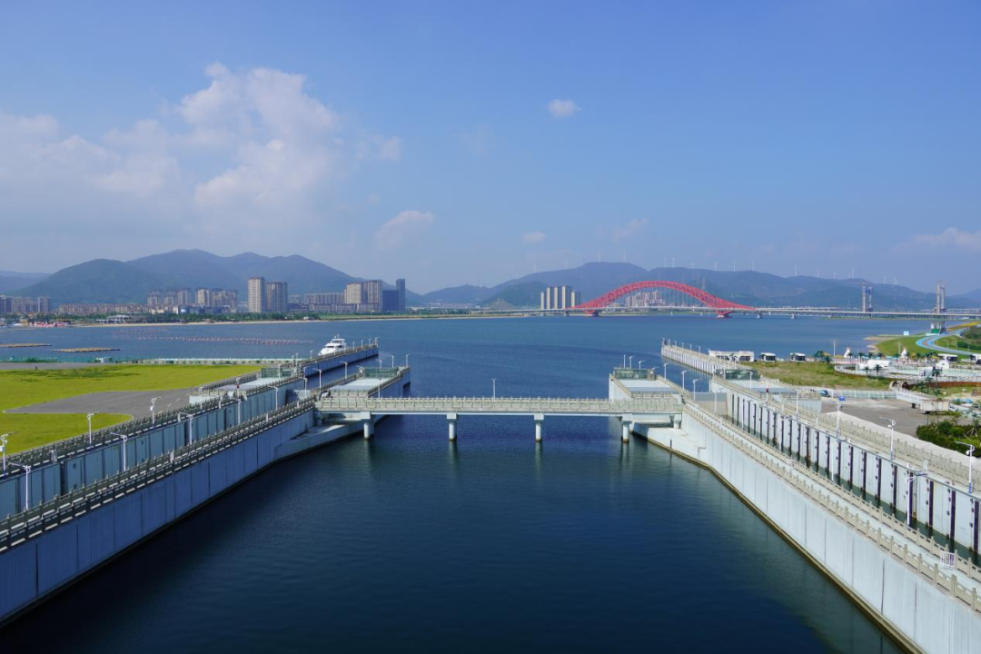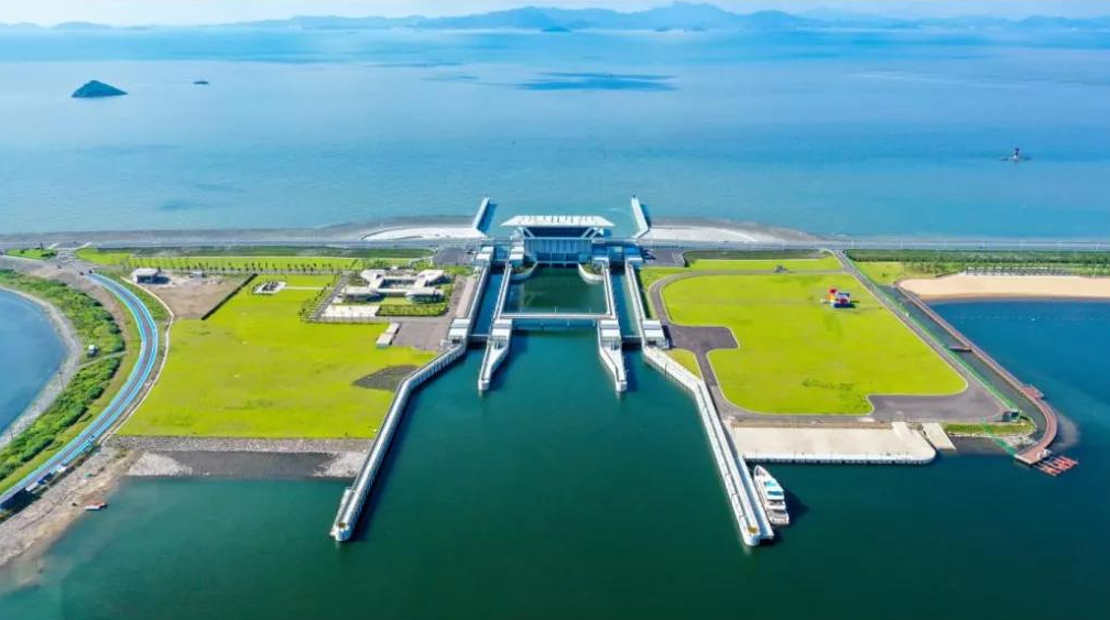 該工程位于北侖區(qū)梅山島與穿山半島西南部之間的梅山水道。工程東臨梅山保稅港區(qū),西鄰北侖春曉濱海新城,北瀕白峰上陽片,南接象山港,工程區(qū)治理南北向總長11.5km,水面積 9.63km2,正常庫容約 5000萬m³。項目由海堤、南堤樞紐、北堤閘、泊船區(qū)、管理區(qū)等組成。
