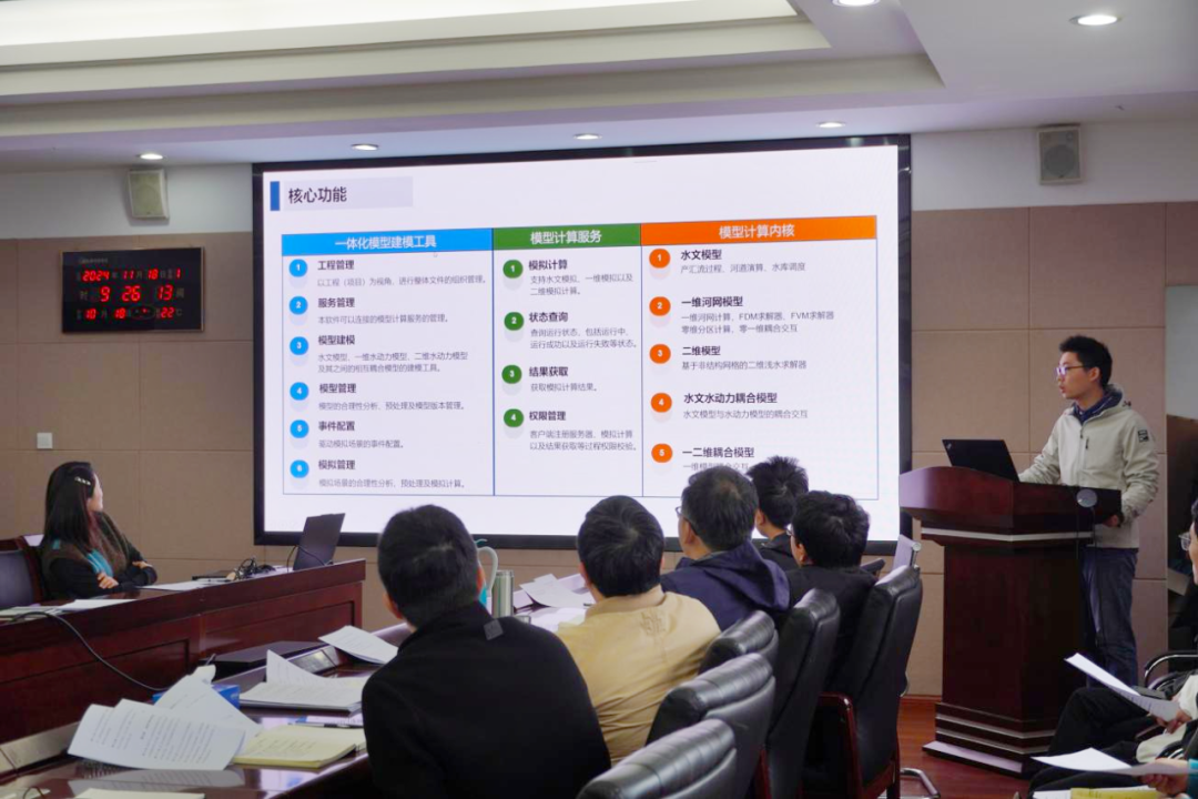 隨后,平臺研發(fā)團隊代表陳龍贊對“澤圖水文水動力一體化模型平臺”進行詳細介紹,并進行現(xiàn)場實操演示。該平臺是一套我院自主研發(fā)的以組件化建模、并行化求解、在線化計算、一體化耦合、國產(chǎn)化支持為核心的水文水動力模型平臺,能夠滿足包括產(chǎn)匯流計算、水庫調(diào)度、一維河網(wǎng)、二維淹沒、水文水動力耦合、一二維水動力耦合在內(nèi)的多種模擬需求,適用于獨立部署、嵌入第三方項目等多種應用場景?;诮9ぞ摺⒛P头?wù)、計算核心三分離的設(shè)計架構(gòu),平臺具備分布式部署、集群化管理、多節(jié)點負載均衡的動態(tài)能力,滿足靈活適用多種尺度的計算需要。